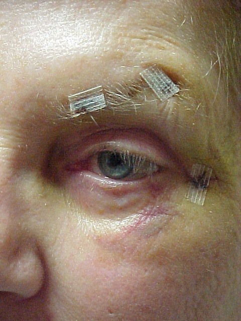 Ptosis crutches — Supports added to the top, the backside of eyeglasses, and they serve to lift the eyelid and help keep it open. Ask your optician if they can fit your glasses with these crutches. Also, a google search for “ptosis crutches for eyeglasses” will provide the names of numerous optical businesses that can install ptosis crutches.